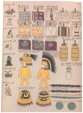 quetzal bird feathers and miniature shields of gold.