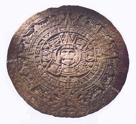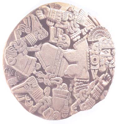 surface of a stone disk emblazoned with the image of the sun. He is