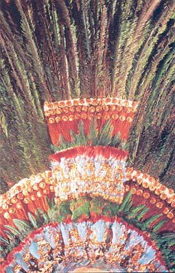 Detail of an elaborate Aztec headdress composed of shimmering green