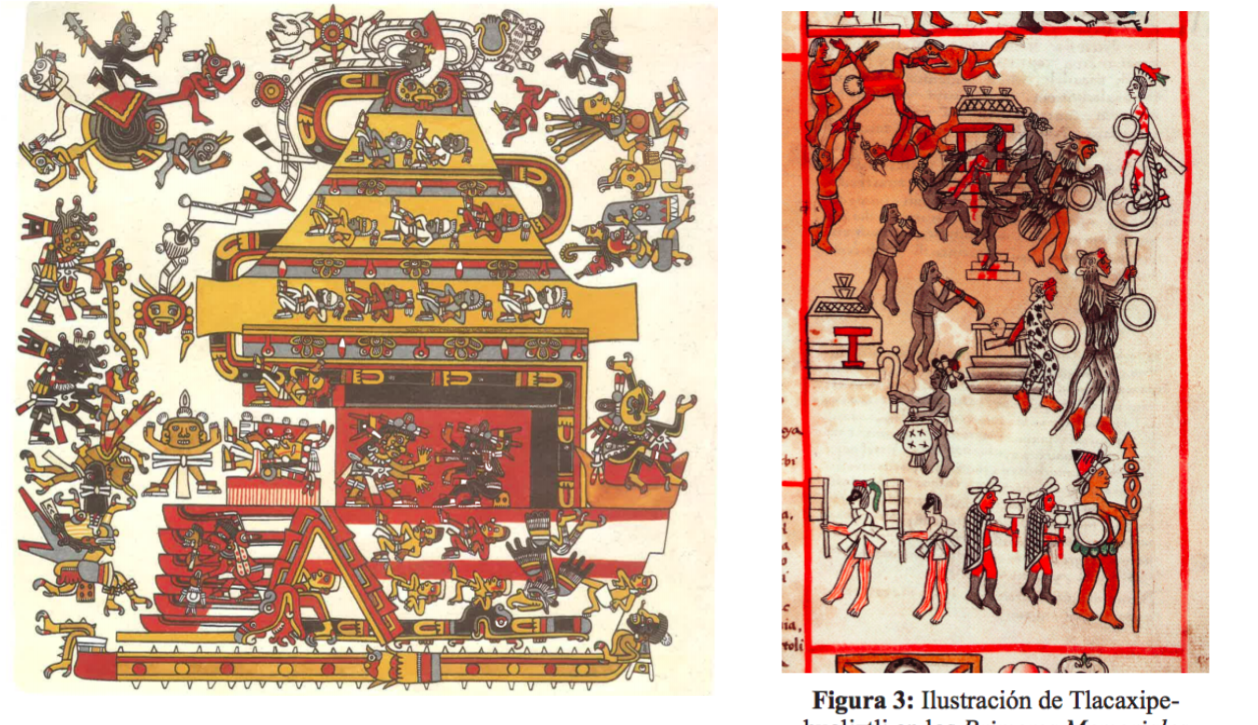 When compared side by side, it becomes clear that Milbrath was indeed correct and that page 33 of the Codex Borgia does in fact depict the month of Tlacaxipehualiztli.  Both scenes contain various people participating in a festival while holding various objects such as pantlis, weapons, and incense bags.  There are also priests performing a sacrifice in both scenes.  The most important piece of evidence however in the scenes that ties them to the month of Tlacaxipehualiztli is the presence of Xipe Totec because Xipe Totec is the Teteoh that Tlacaxipehualiztli is dedicated to consistently throughout all primary sources.  An additional component of the Borgia scene is extremely important for the correlation of the Xiuhpohualli.  On the top of Teocalli, there is a priest dressed as Itztli who is observing the sun.  Considering the new year begins a day after the spring equinox according to the tonalpohualli correlation and Indigenous people made astronomical structures to mark the equinox all over Mexico, this image firmly places Tlacaxipehualiztli as the first month of the year, one day after the spring equinox.